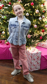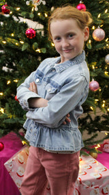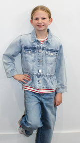 A denim jacket featuring a peplum at the bottom and a collar on it.