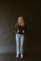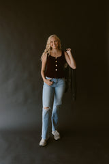 A maroon velvet tailored vest with a square neckline and gold buttons down the middle.