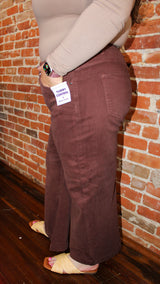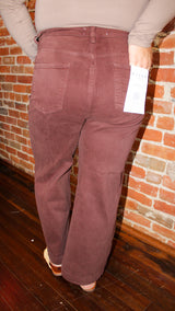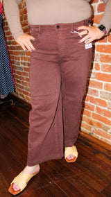 A pair of chocolate brown high-rise, wide-leg, and an adjustable waistband.