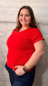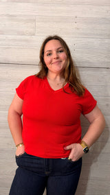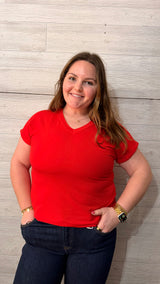 Your new go-to everyday tee ❤️ This vibrant red top features a flattering v-neckline and relaxed fit that makes it easy to throw on and go. The soft, lightweight fabric keeps it comfortable all day long, while the slightly loose silhouette gives it that effortless, casual vibe. Pair it with denim, shorts, or layer it under a jacket for a pop of color year-round.