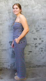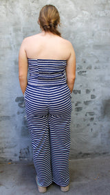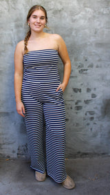 The ultimate comfy-chic set 💙🤍 This navy and ivory striped two-piece is giving effortless, coastal vibes. Featuring a strapless bandeau-style top and matching high-waisted, wide-leg pants, this set is lightweight, soft, and made for all-day comfort. The relaxed flow of the pants pairs perfectly with the fitted top for a flattering, balanced silhouette.
