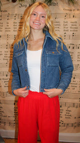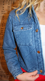 A dark denim quilted jacket with 2 pockets on the front and a collar.
