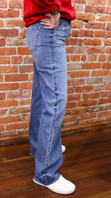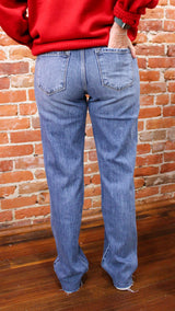 A pair of high-rise straight jeans that are a medium wash. These jeans have a small fray on the bottom.