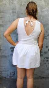This feminine mini features a flattering v-neckline with delicate trim detailing and a beautifully structured bodice with subtle vertical pleating for the perfect shape. The fitted top flows into a soft, flared skirt that gives it that effortless, twirl-worthy feel.