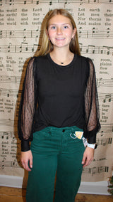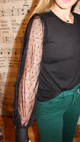 A black long sleeve top with sheer sleeves with small polka dots on the sleeves.