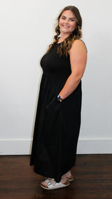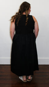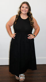 A black jersey knit top dress with a flowy bottom. The dress comes with pockets on the sides.