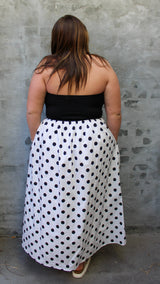 Classic with a playful twist 🖤🤍 This black and white polka dot midi dress is such a timeless statement piece. Featuring a flattering strapless black bodice and a flowy, high-waisted skirt, it creates the perfect balanced silhouette. The lightweight fabric gives it beautiful movement, making it just as comfortable as it is eye-catching.