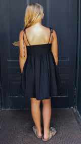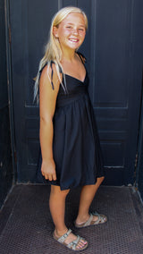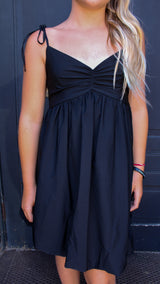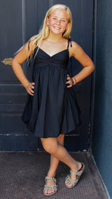 A black dress with adjustable straps that is perfect for any occasion.