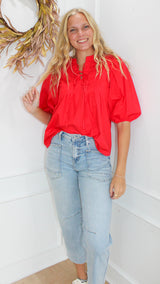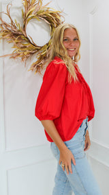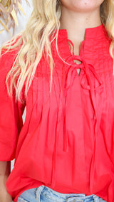 A long sleeve red top with small bow details on the front and a slight peplum on the bottom.