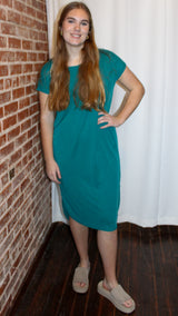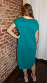 An elevated t-shirt dress with drop sleeves and a rounded hem on the bottom.