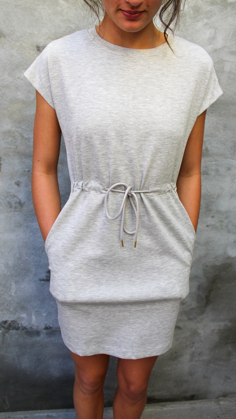 A heather grey dress with a tie synch waistband.