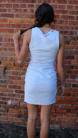 A baby blue colored dress with a scooping neckline and a scrunch on the side. This dress can be worn as is or as a swim cover-up.