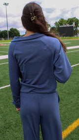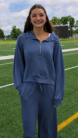 A dark blue colored quarter-zip sweatshirt with a kangaroo pocket on the front.
