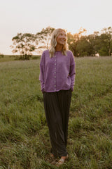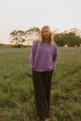 A light purple button-up cardigan that can be worn buttoned or up-buttoned.