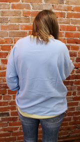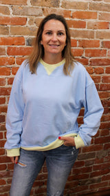 A baby blue crewneck with butter yellow detail on the sleeves and v-neckline.