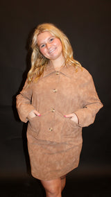 A camel vegan leather collared jacket.