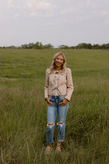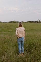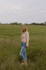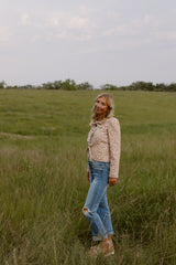 A quilted jacket with a slight puff sleeve and ties in the front to leave tied or untied.