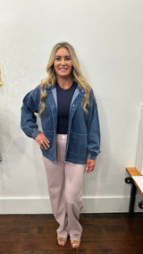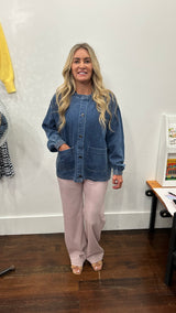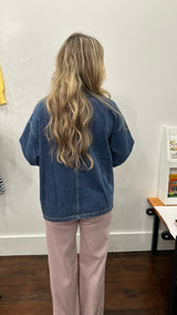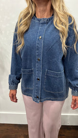 A boxy denim jacket with gold buttons and 2 pockets on the front.