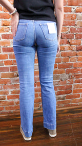 A pair of high-rise, slightly flared jeans that are a dark wash.
