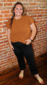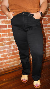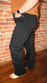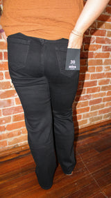 A pair of smokey black jeans that are high rise straight leg. The bottom can be cuffed or un-cuffed.