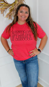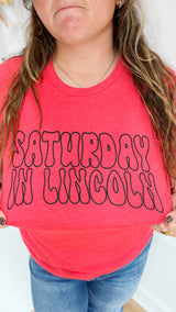 A red basic t-shirt that says "Saturday in Lincoln" on it.