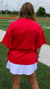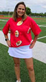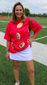 Cheer on your team in style with this dazzling gameday tee featuring an array of sequin football patches on the front. Get ready for those game day football games.