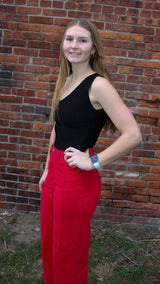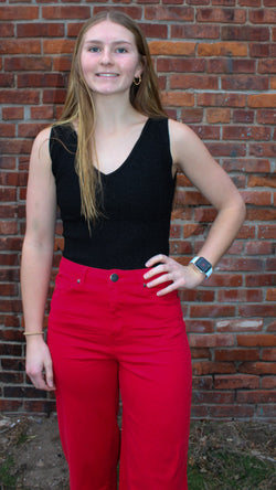 A black v-neckline tank top with slightly ribbed detail and small glitter on it.
