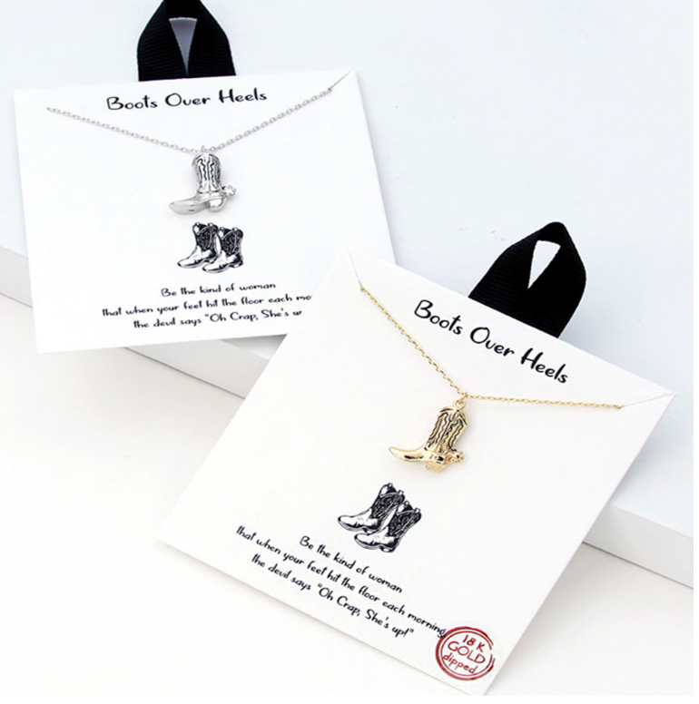 A necklace with a cowboy boot charm on it. Comes in gold and silver.