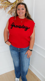 HAND SEWN "GAMEDAY" EMBROIDERED SLEEVELESS SWEATER TOP LETTERING IS HAND SEWN, MAKING EVERY PIECE UNIQUE GREAT FOR GAME DAY