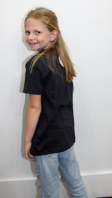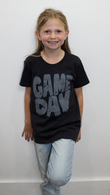 A kid's black shirt that says "Game Day" on it in grey writing.