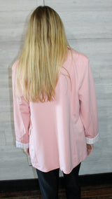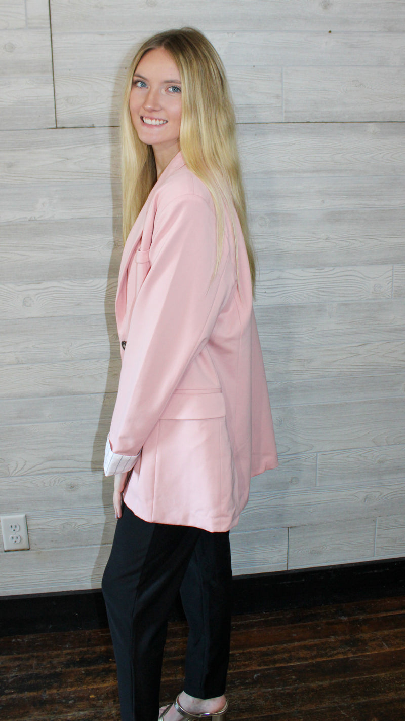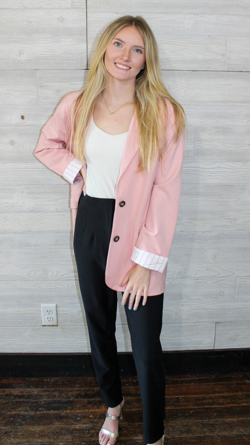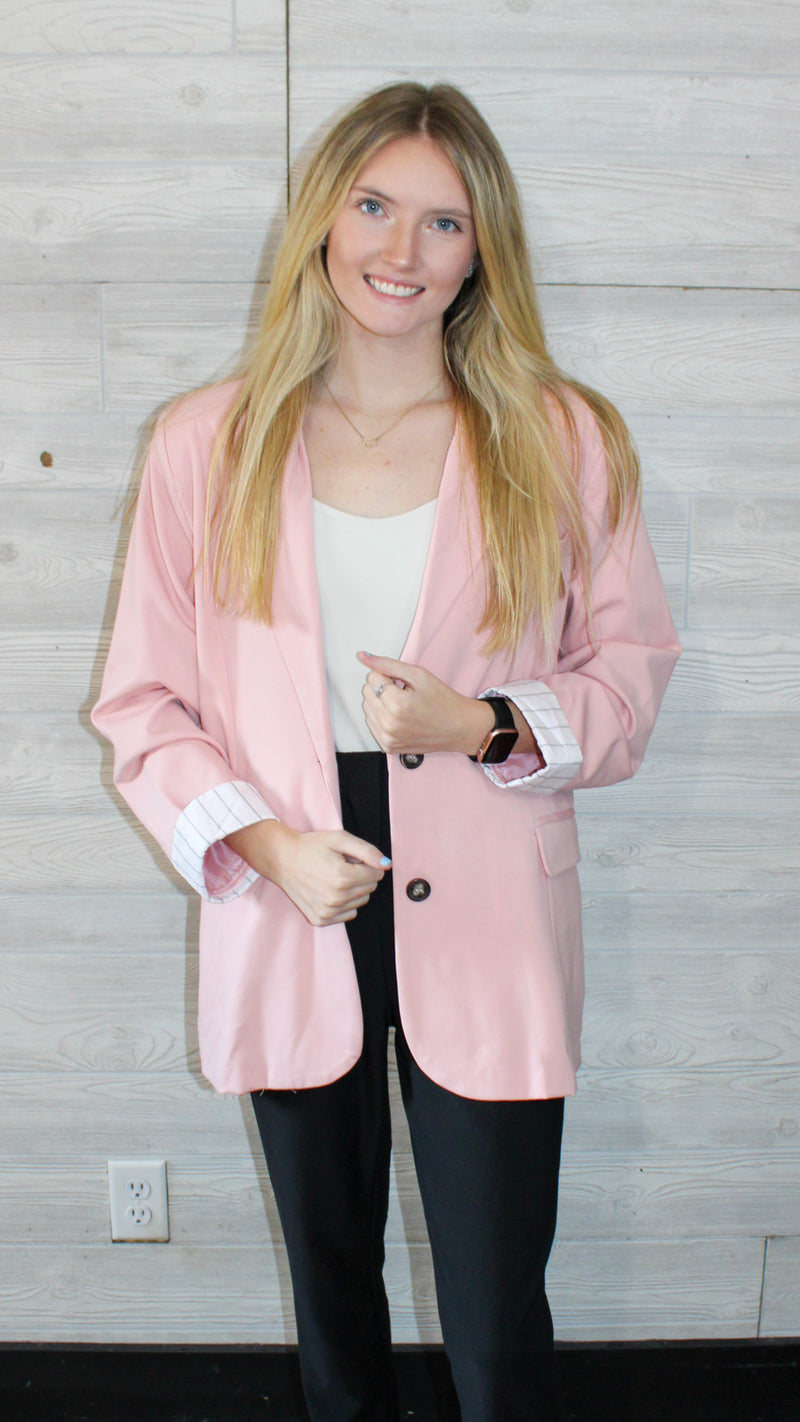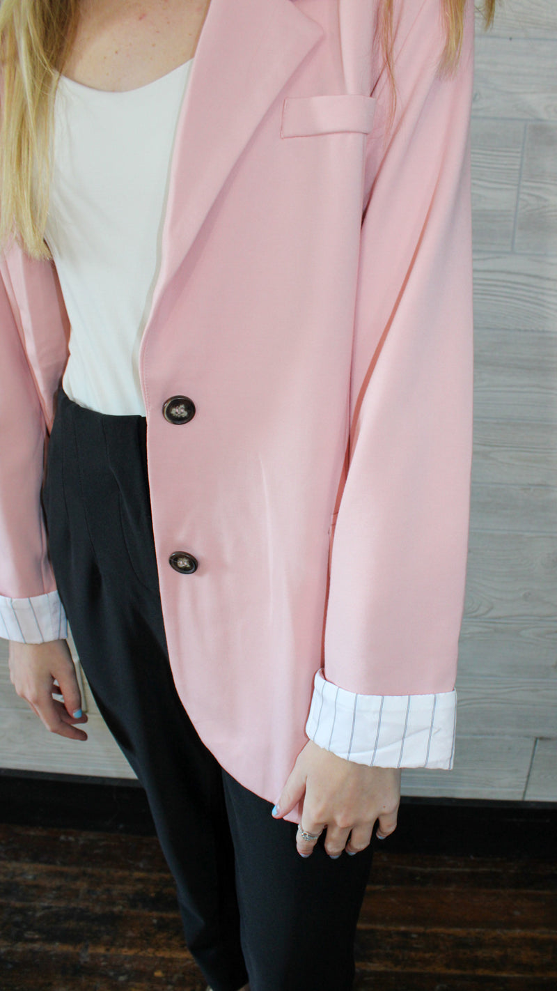 A light pink blazer with a cuffed sleeve with small striped detail on the cuffs.