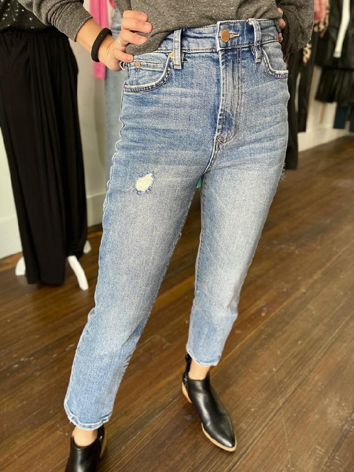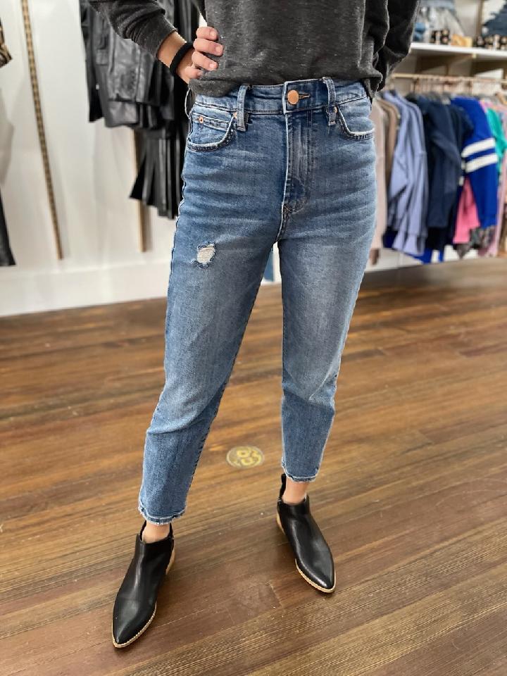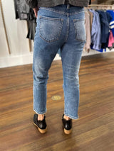 A light wash pair of jeans that are ankle length with minor distressing and a straight leg.