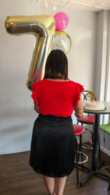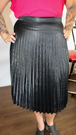 A black midi skirt with pleats on it. The skirt has a zipper on the side to fit appropriately. There is a lining under the skirt. This is an awesome choice for the holidays if you don't want something super sparkly.