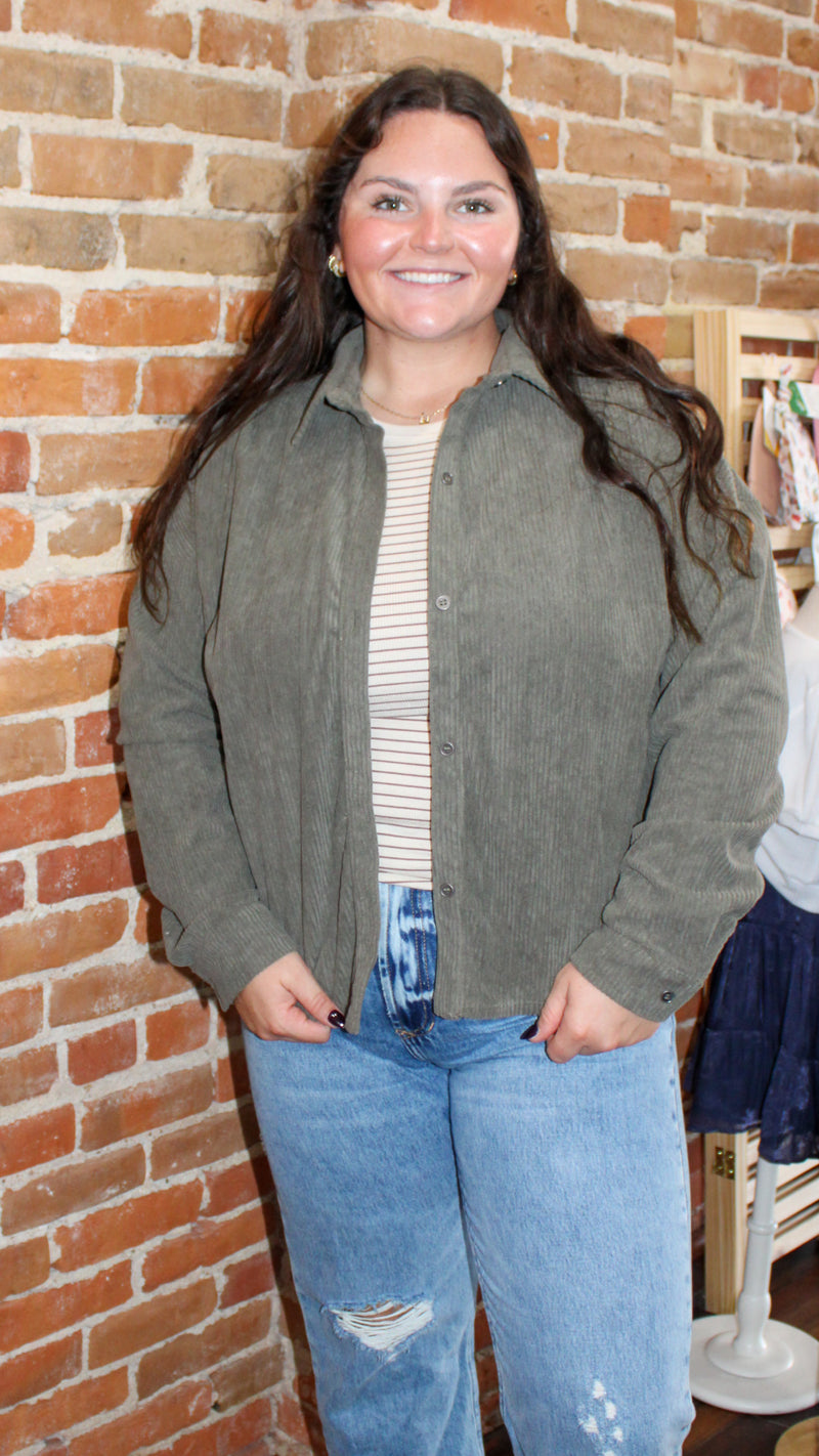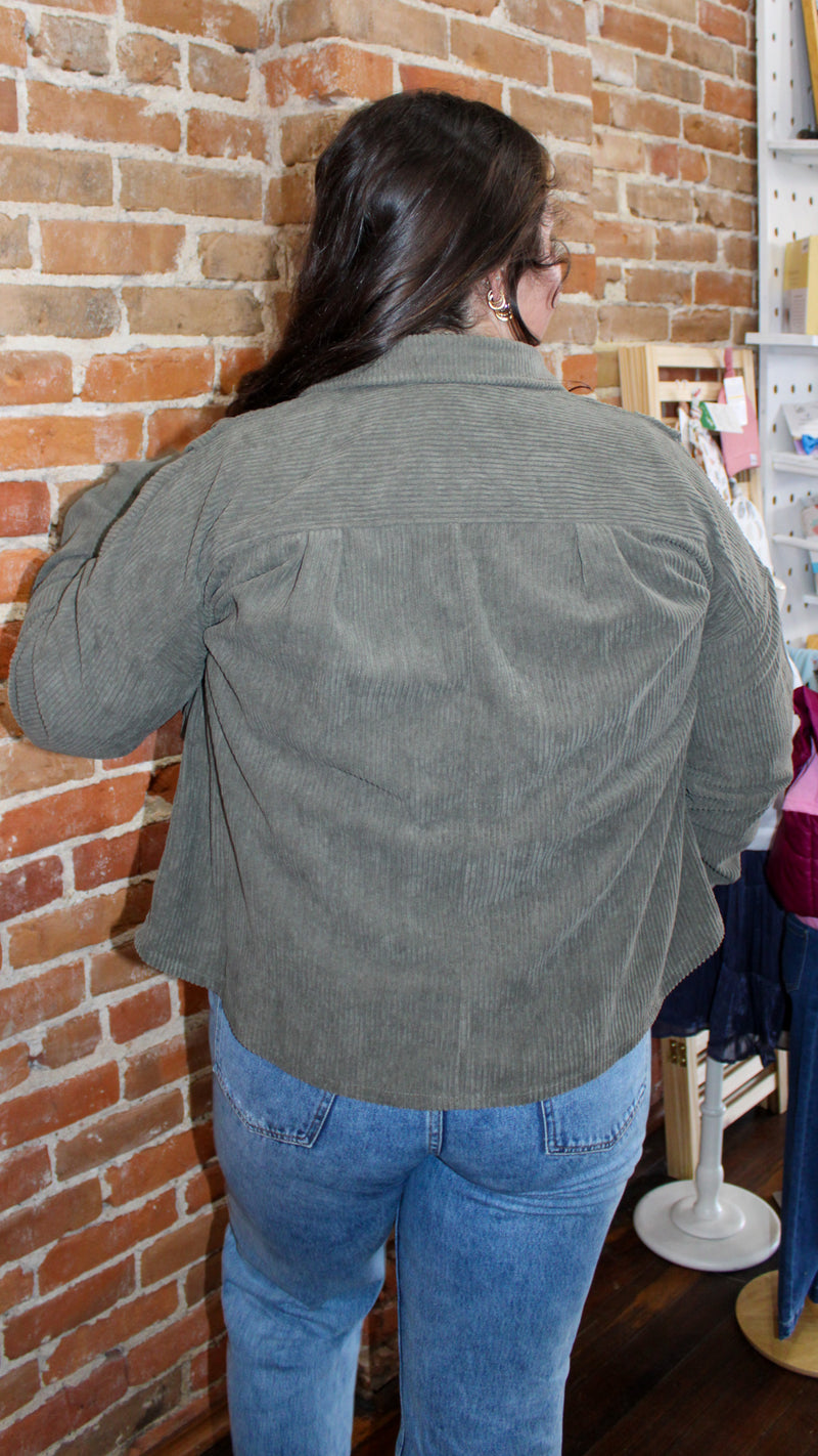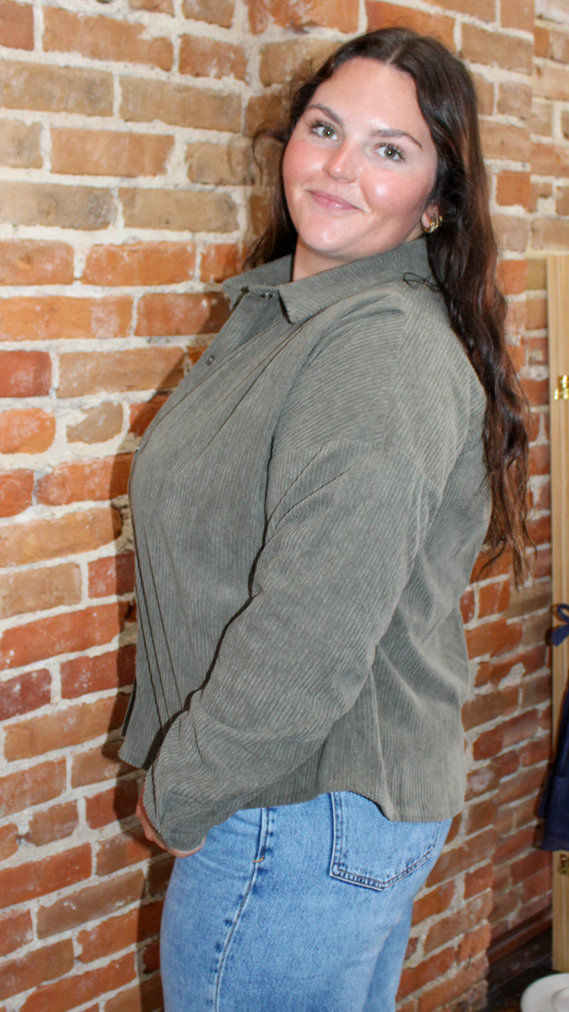 A Corduroy olive green jacket with a slight pleat detail on the shoulder with a button detail on the front.