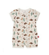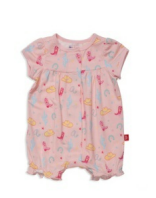 A romper with a country design on it and magnetic buttons. Comes in beige and pink
