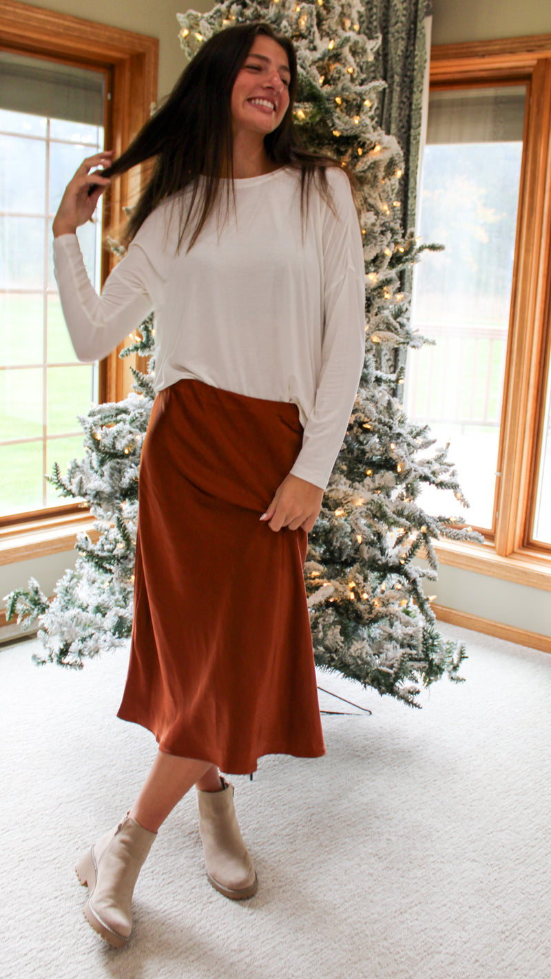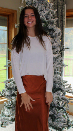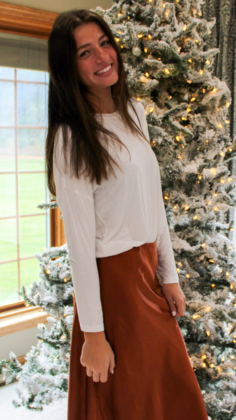 An off-white long-sleeve top that is ideal for layering under a vest, sweater, cardigan, or jacket. It can be worn as is.