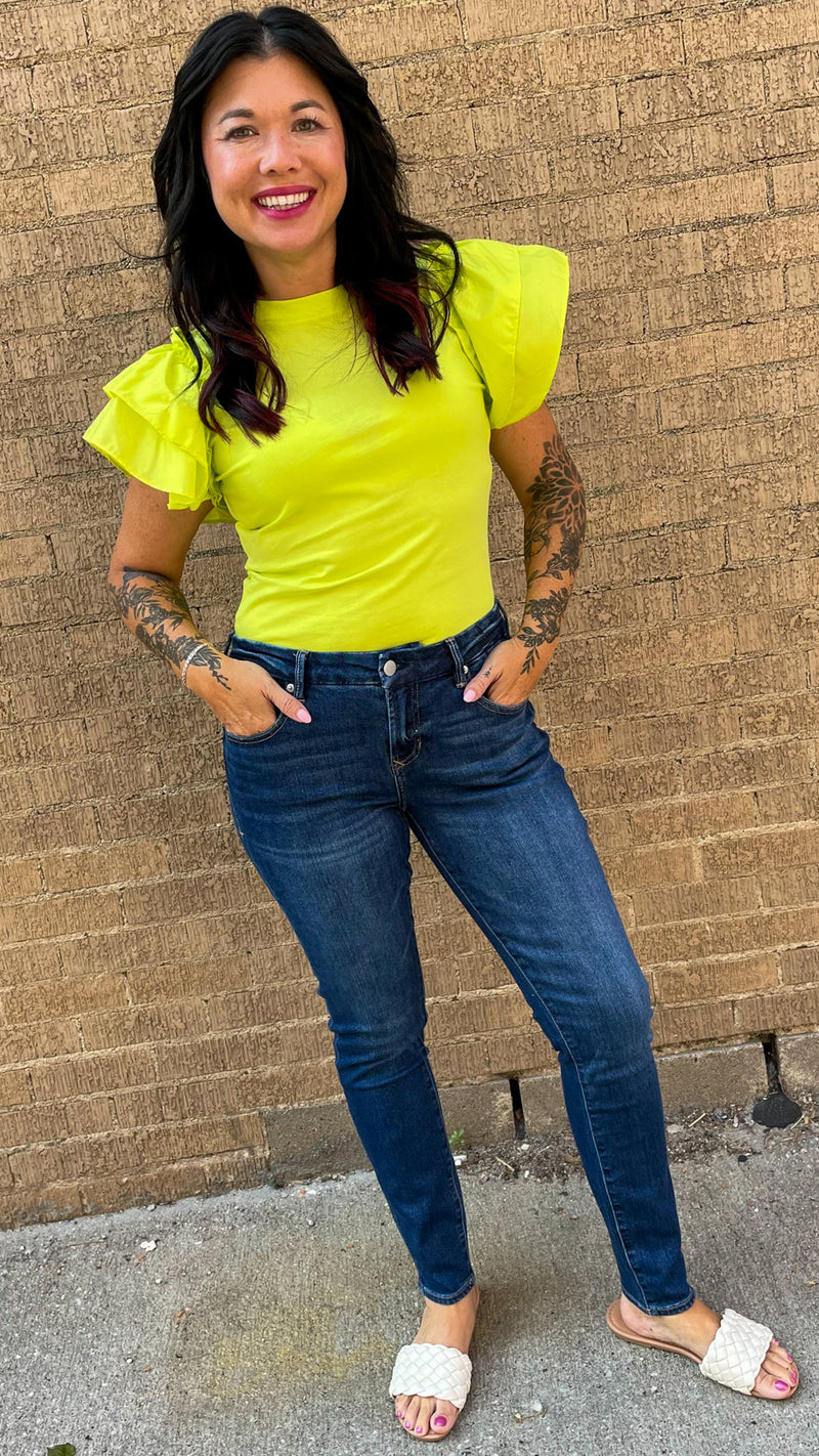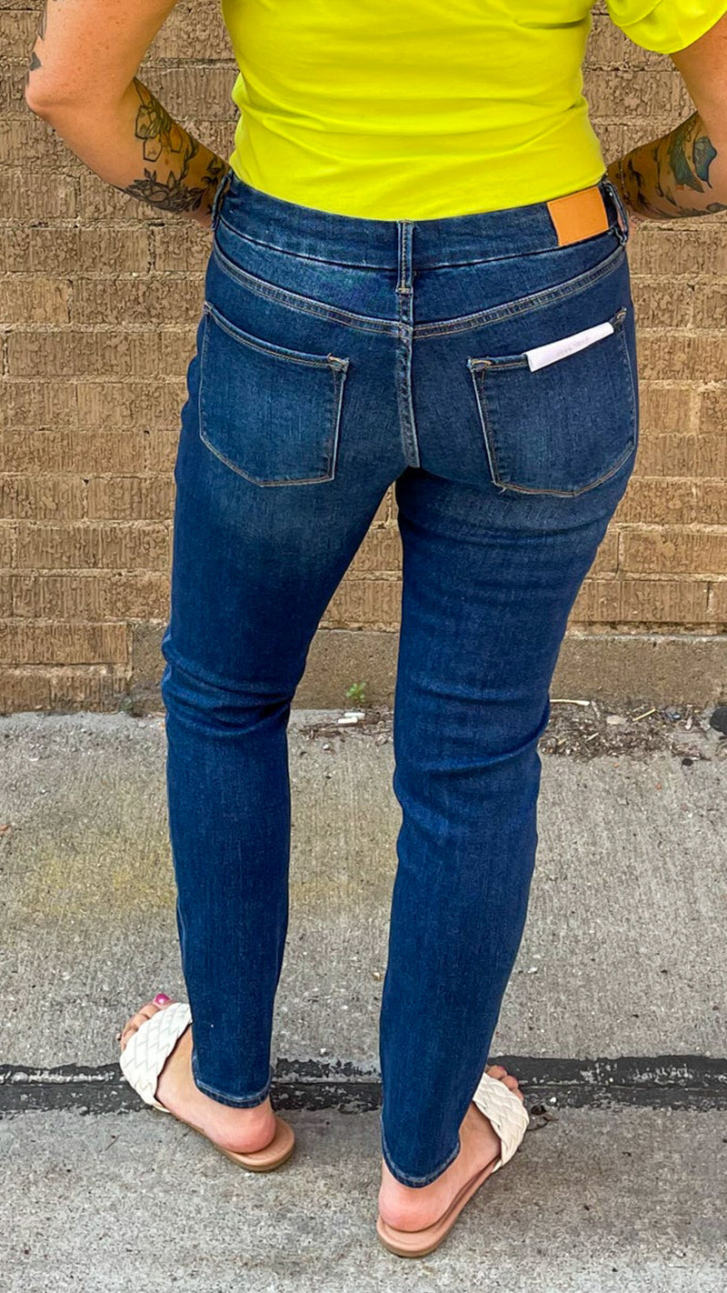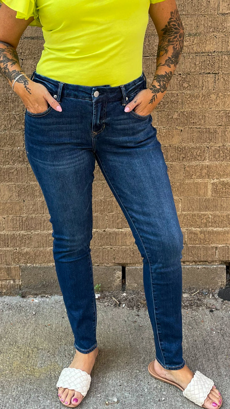 A dark wash pair of jeans. Stretchy, not stiff denim.