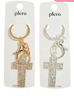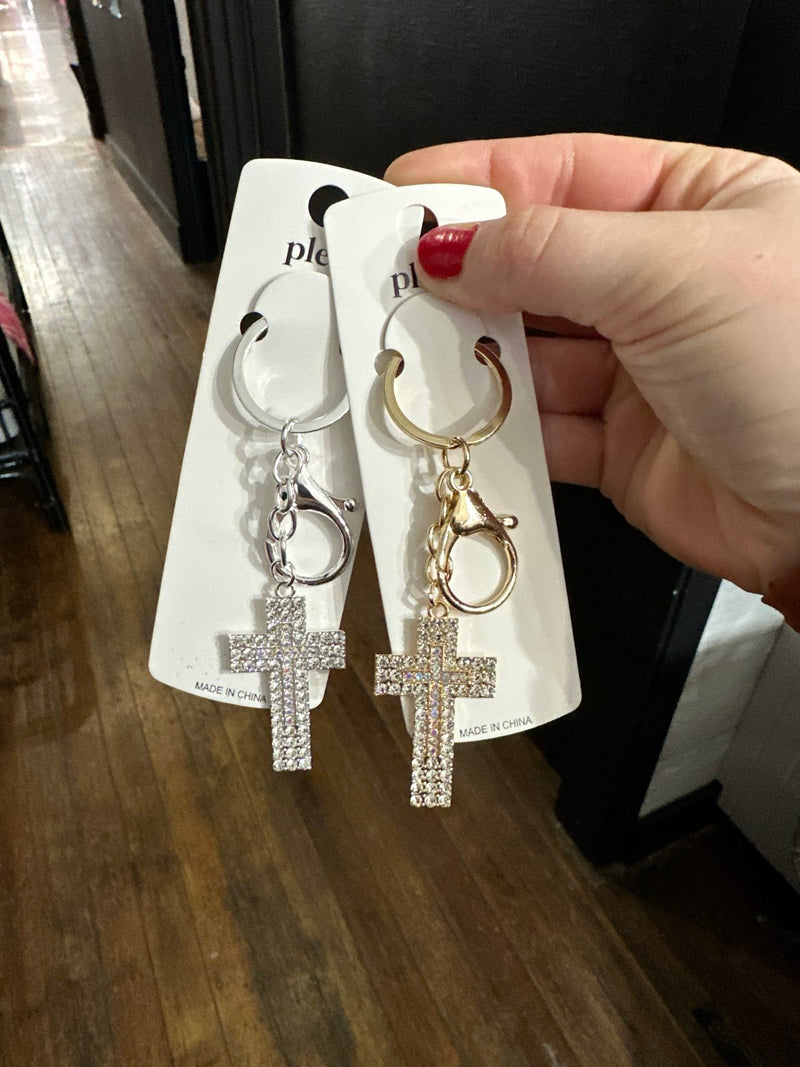 A cross keychain with a clasp on it to clip to your keys.