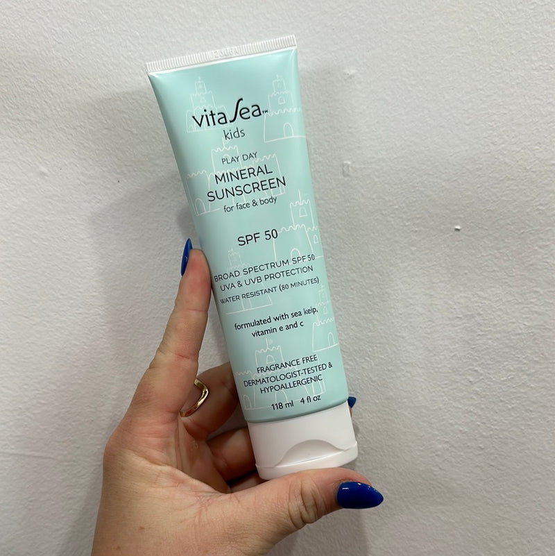 Vita Sea kids sunscreen for face and body. SPF 50 and water resistant for 80 minutes.