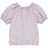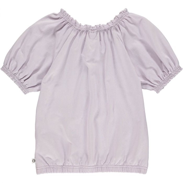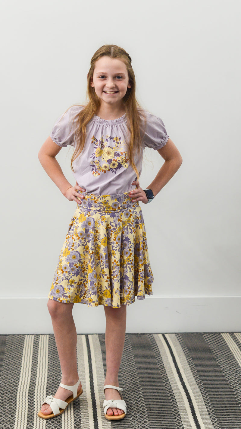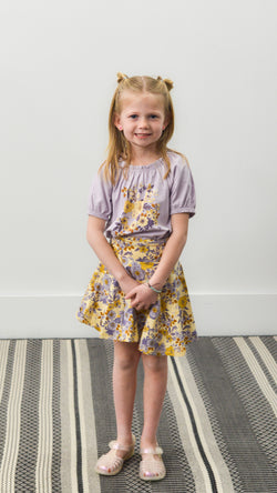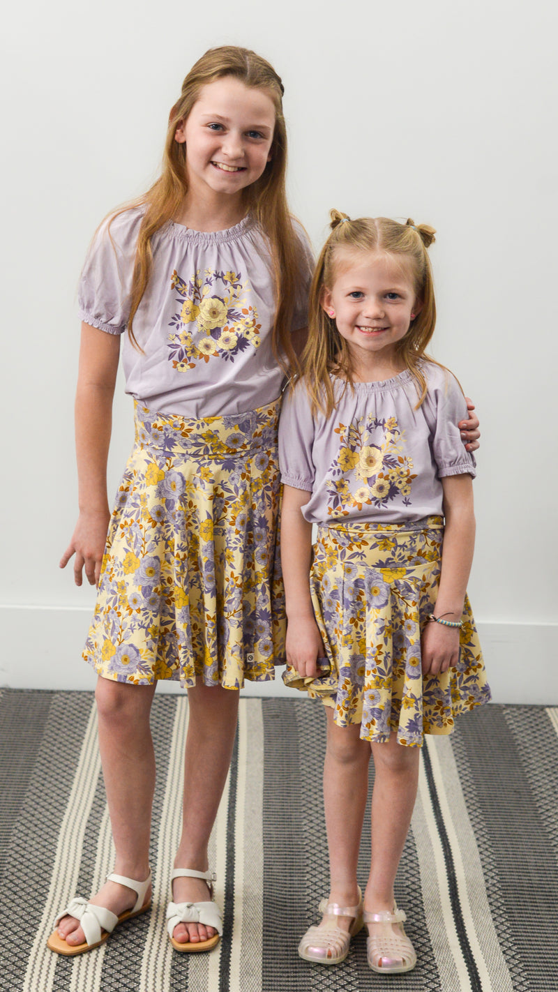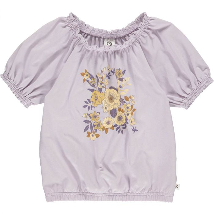 A light purple top that has yellow flower print in the center of the shirt. This top also has puffy sleeves and a cinched neckline.