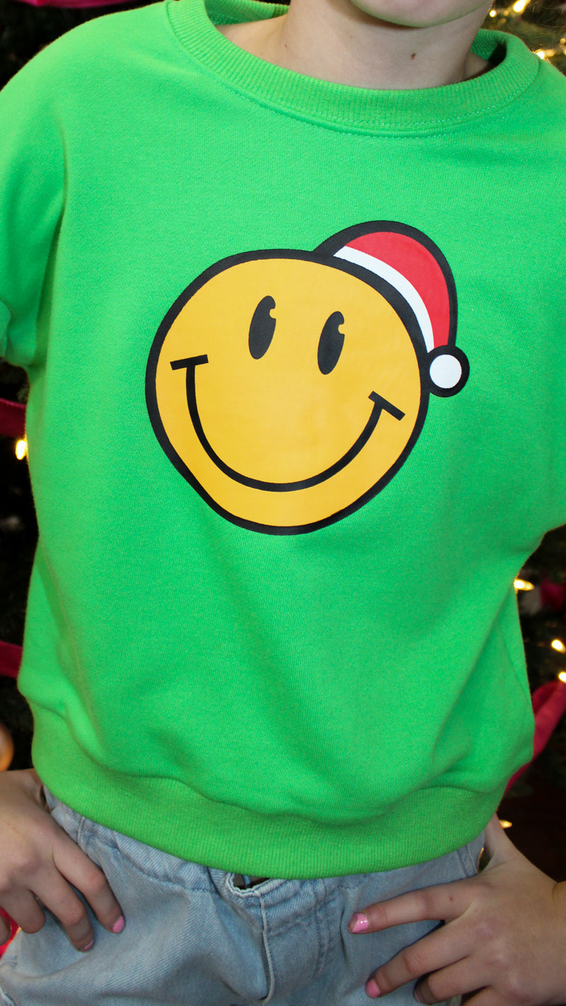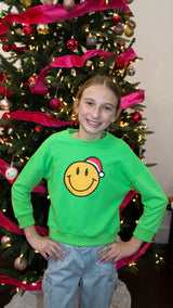 A crewneck for boys and girls that has a smiley face on it with a Santa hat.