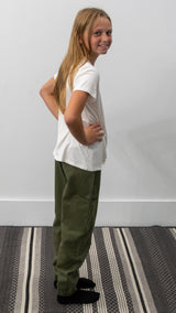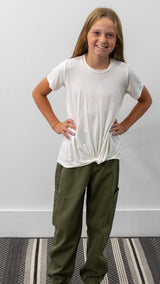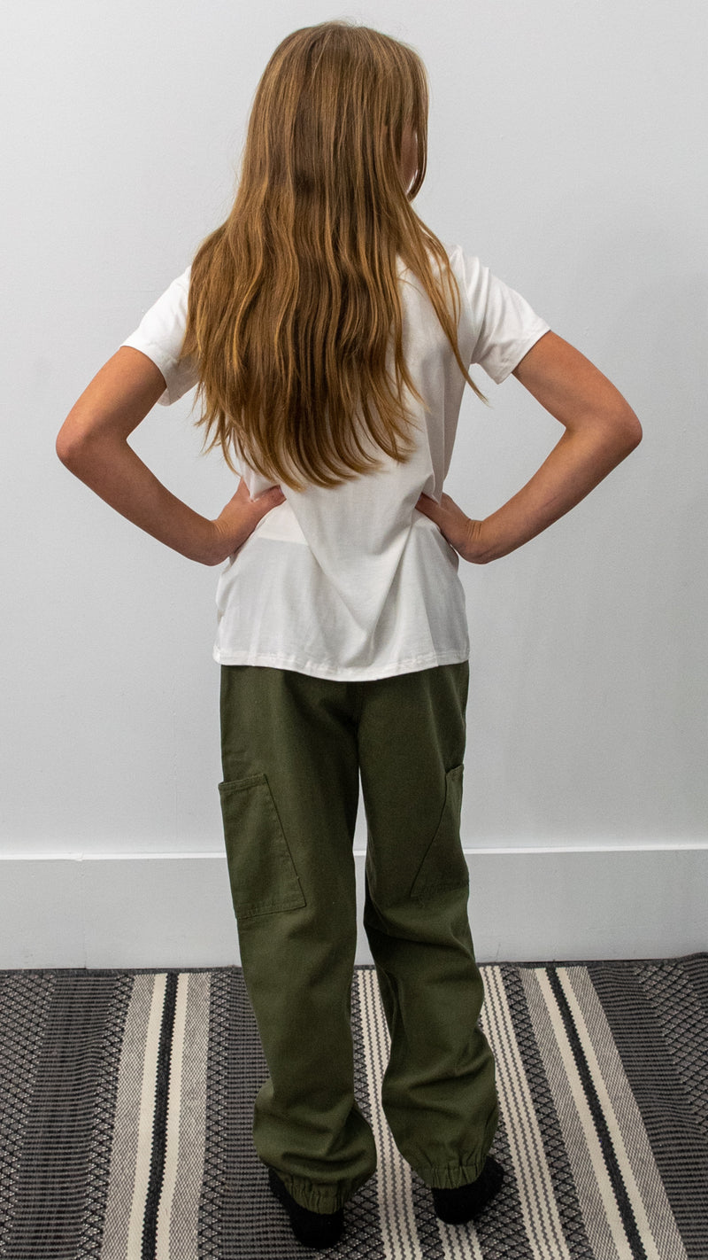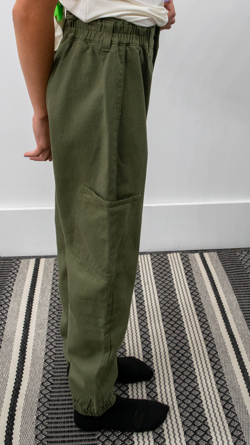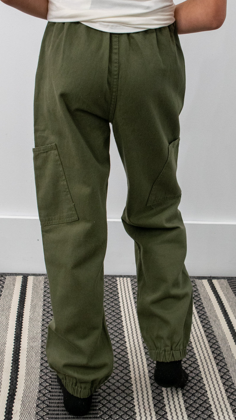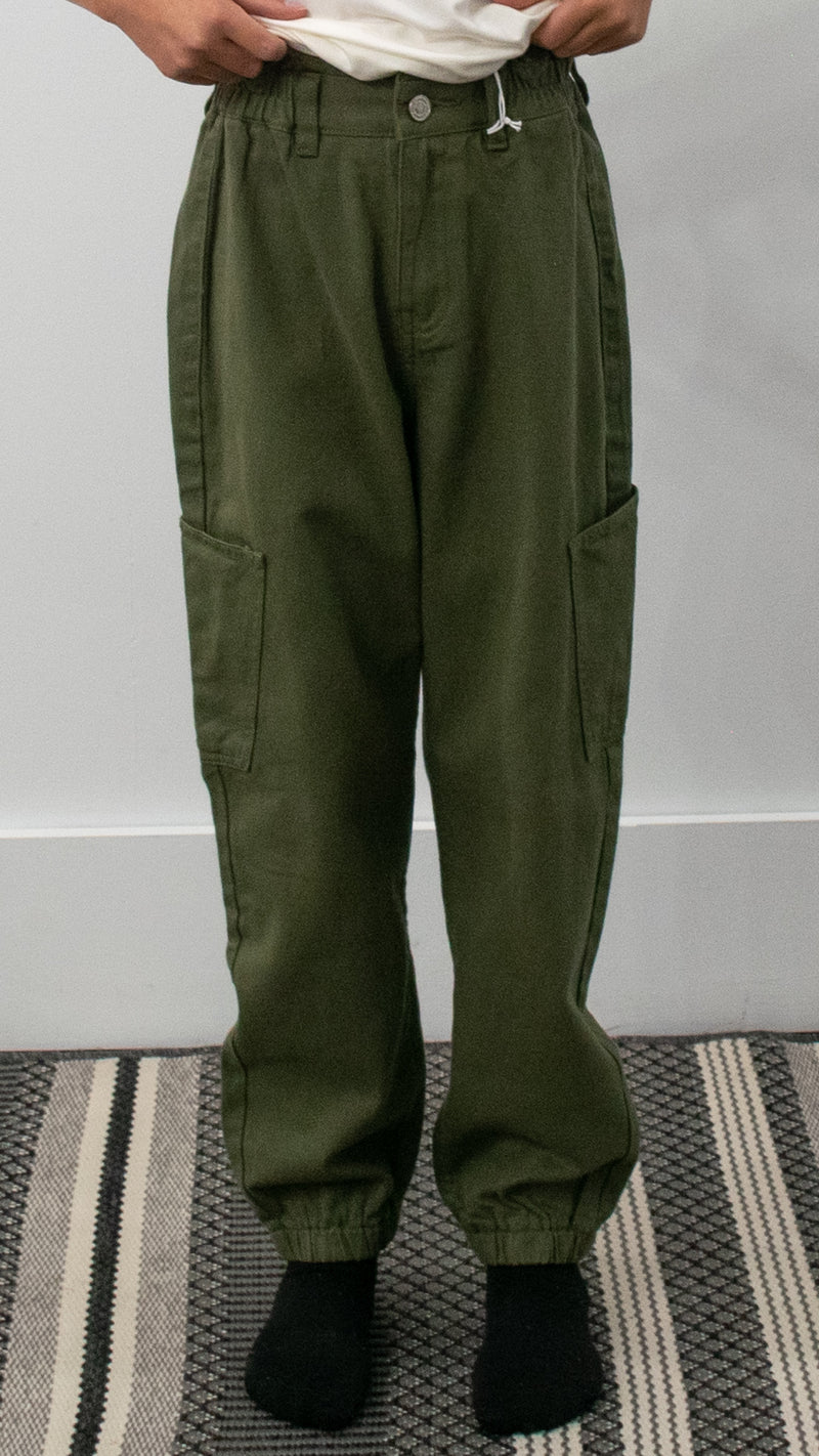 A pair of olive green colored cargo elastic jogger jeans that are perfect way to spice up your kiddos wardrobe.