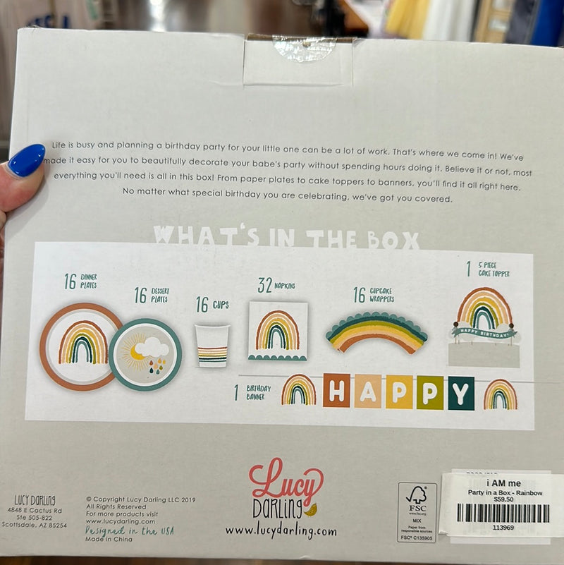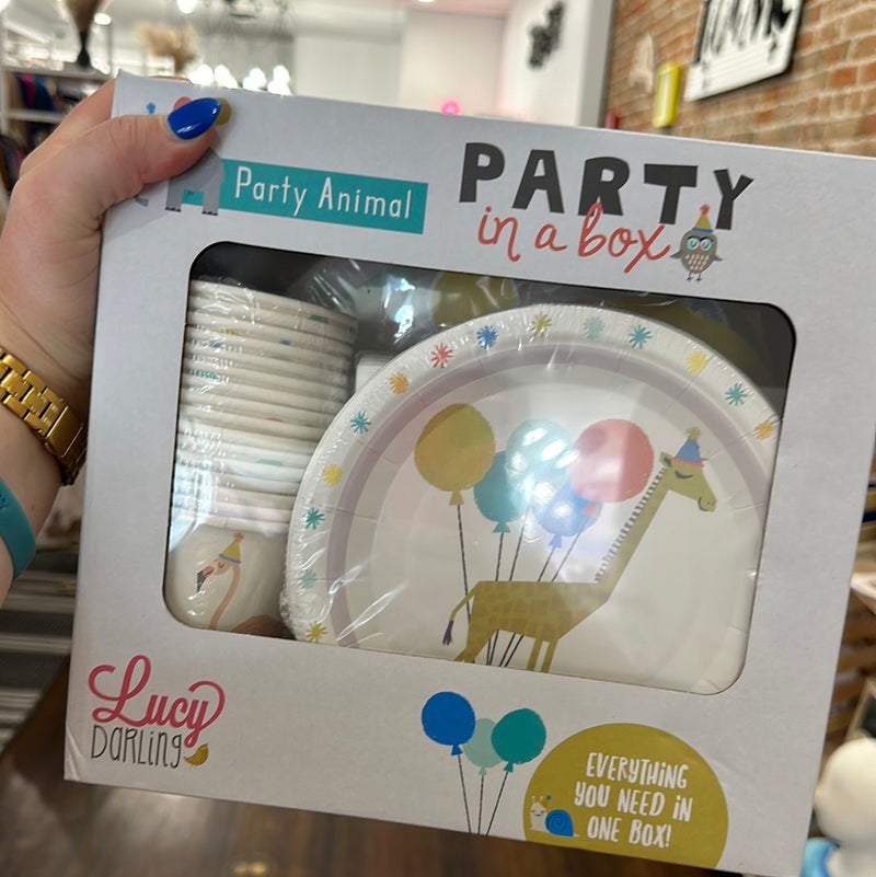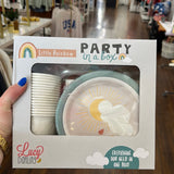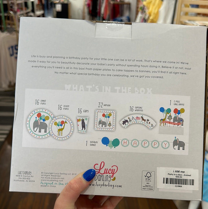 Everything you need for your little one’s birthday! This party in a box includes 16 dinner plates, 16 dessert plates, 16 cups, 32 napkins, 16 cupcake wrappers, 1 five piece cake topper, and 1 birthday banner.