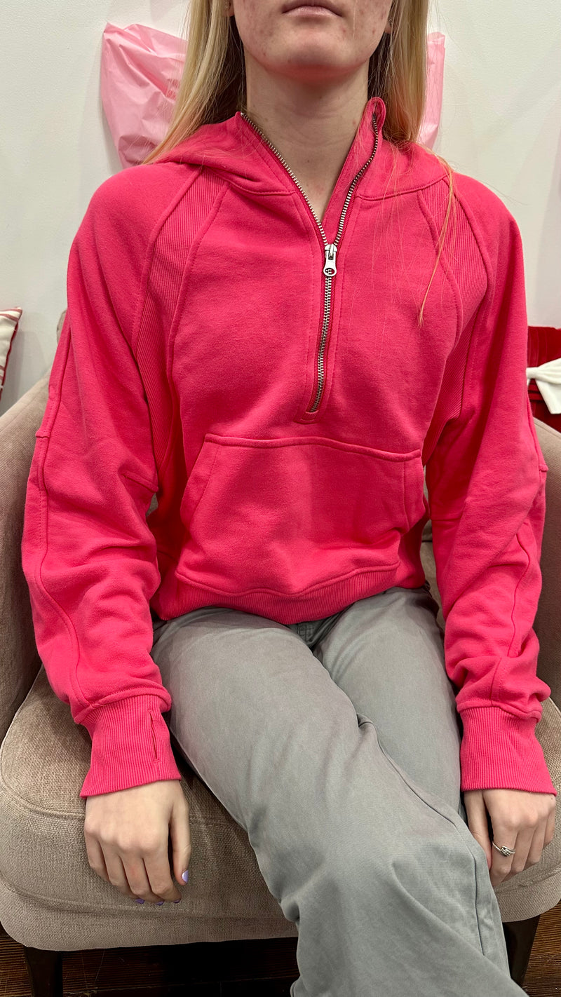 A quarter zip sweatshirt with a hood and a kangaroo pouch. Comes in multiple colors. This quarter zip is perfect for everyday wear and layering with a vest.