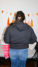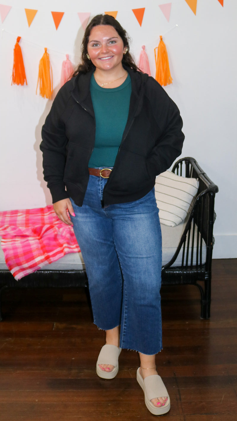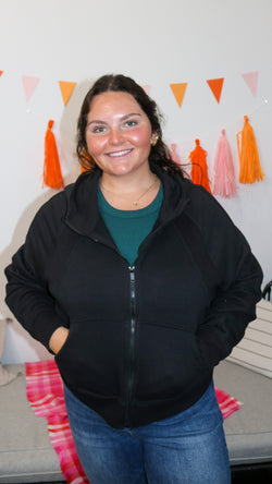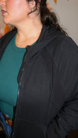 A black full zip-up with pockets and thumb holes.