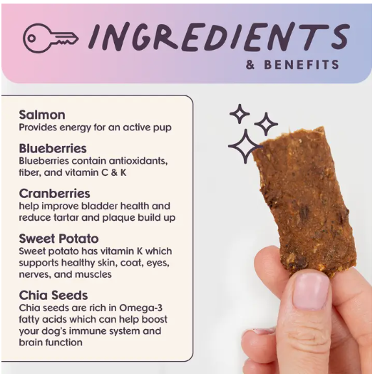 Wild-Caught Salmon is #1 Ingredient. With a Superfood Blend of Sweet Potatoes, Chia Seeds, Blueberries & Cranberries. Perfect for Every Adventure on the Go! Easily breaks into bite-sized pieces for training & small dogs.