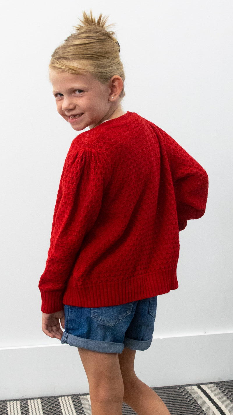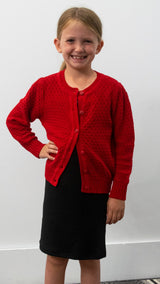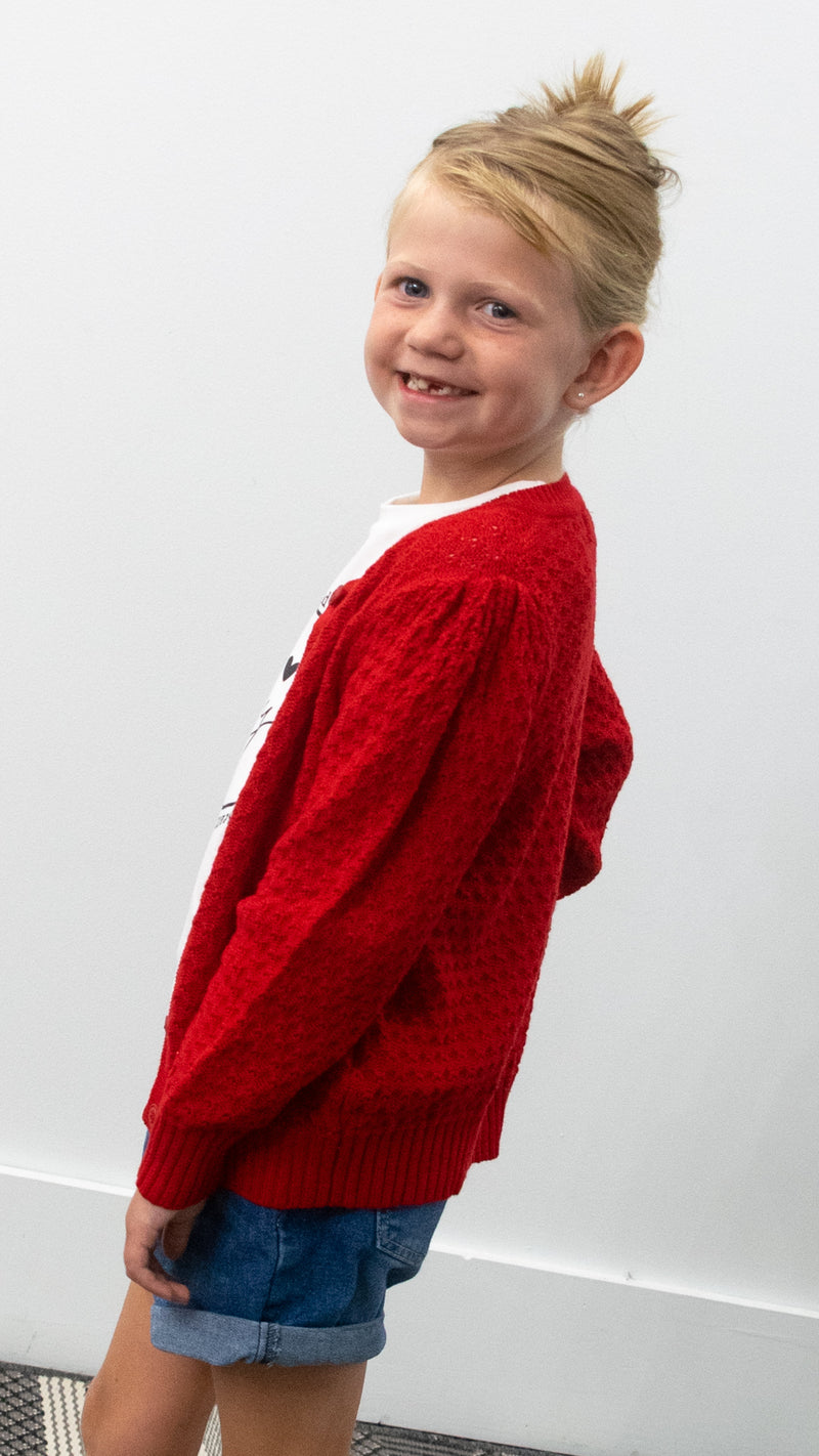 A cardigan that is a beautiful red color. It works perfectly for a lightweight sweater.