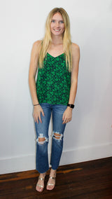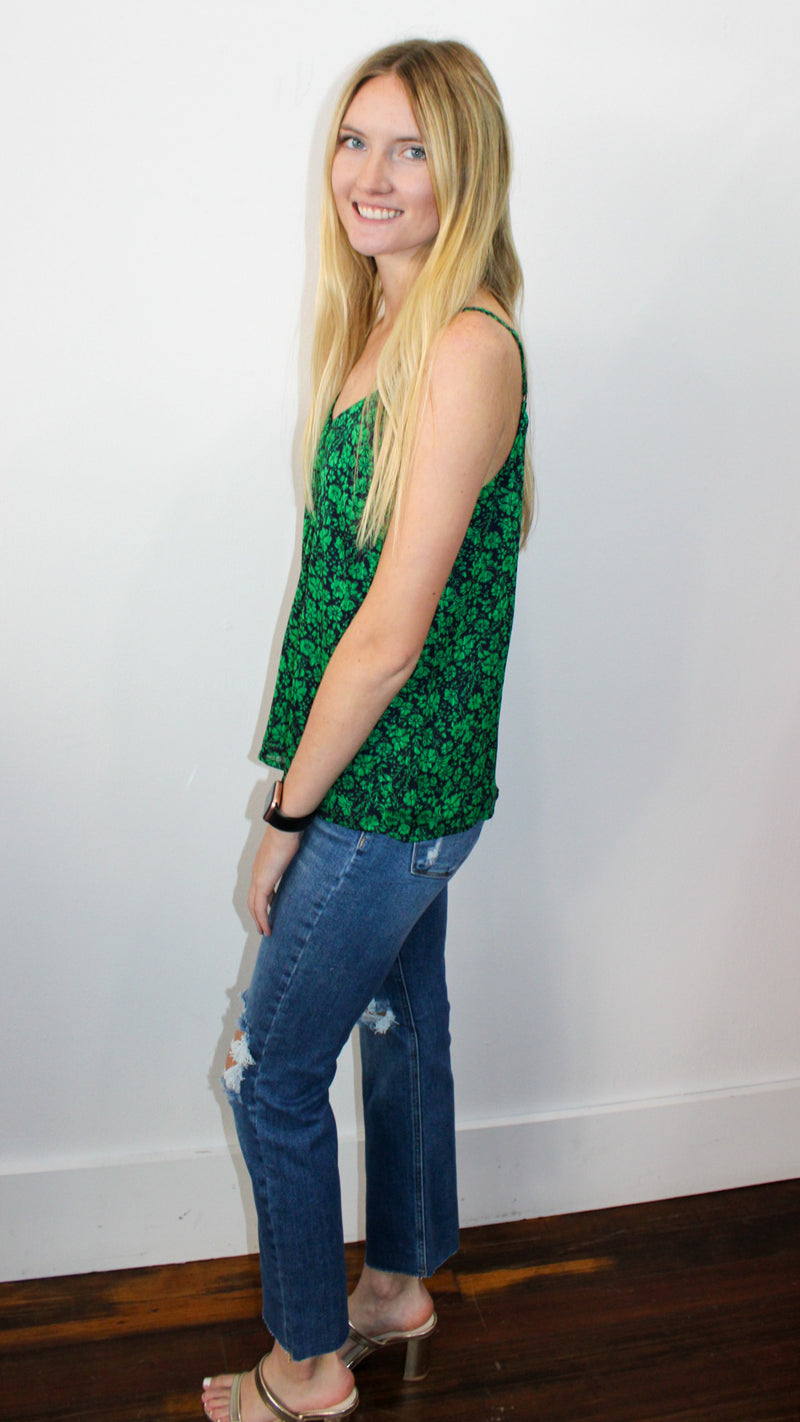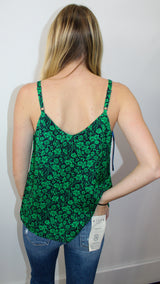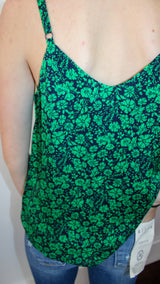 A floral tank top that is green and navy. This tank looks great under any jacket.