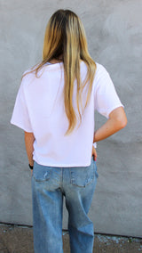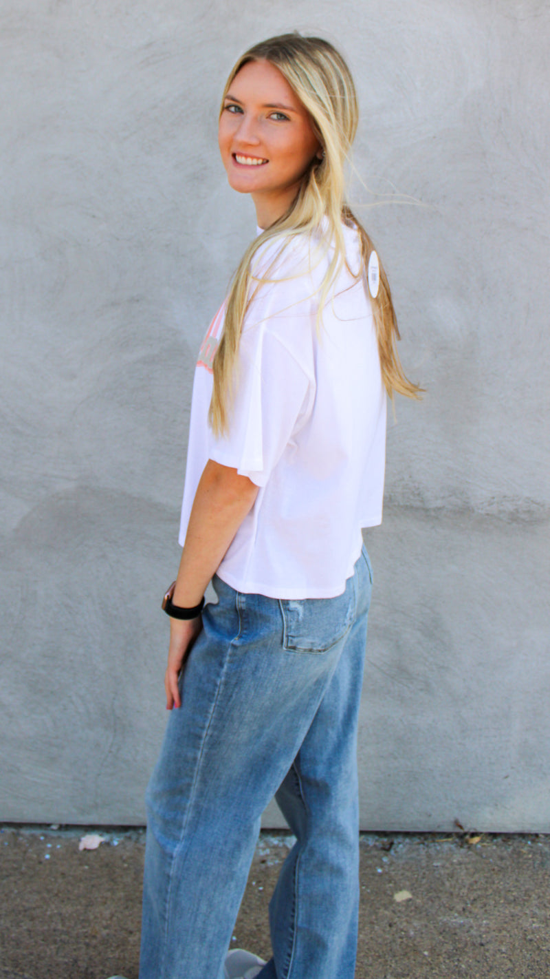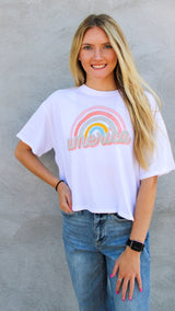 A semi-cropped t-shirt that says America on it with a rainbow.