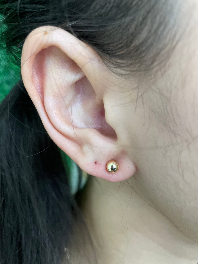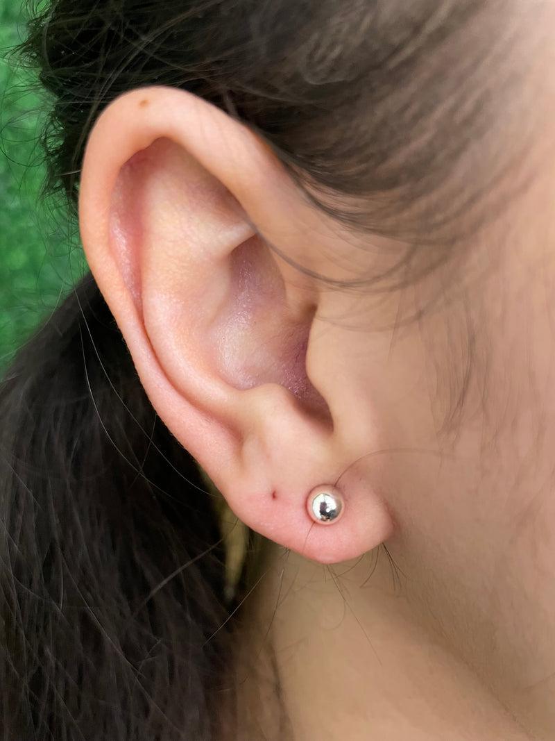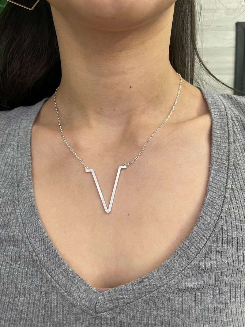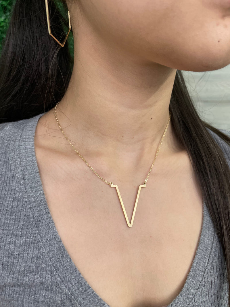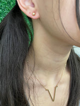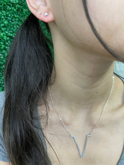 A gold or silver necklace with a V shaped charm in the middle of the necklace and comes with gold or silver studs.